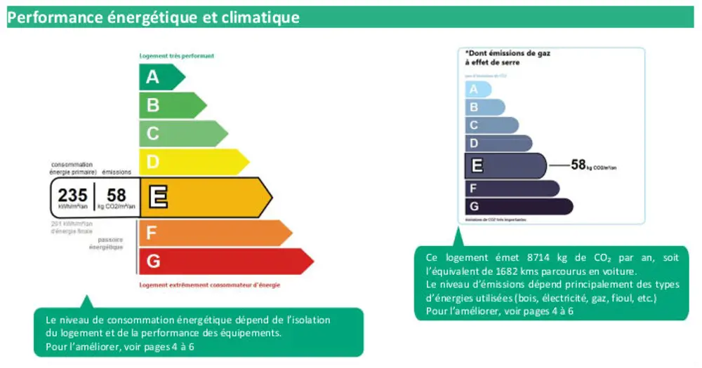 Date de réalisation du diagnostic énergétique : 03/03/2025 DPE : E(235 kWh/m²/an) et GES : E (58 kg CO2/m²/an).